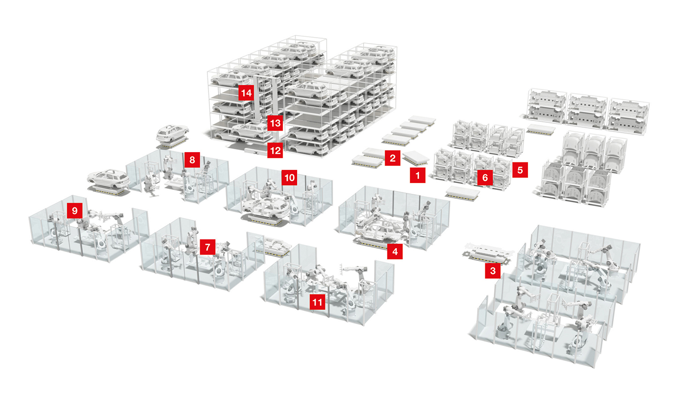 Vehicle body construction is the most automated part of automobile manufacturing. Welding, flanging and lasering as well as riveting and screwing and – increasingly – gluing are typical work processes. Robot cells, collaborative robots and conveyor systems such as skids or electrical monorail systems determine the processes.