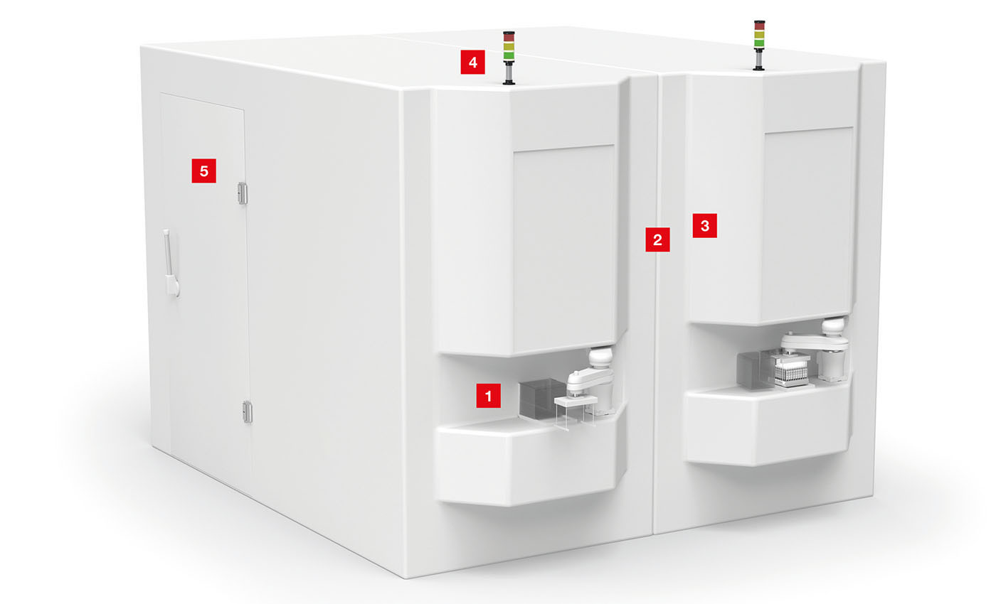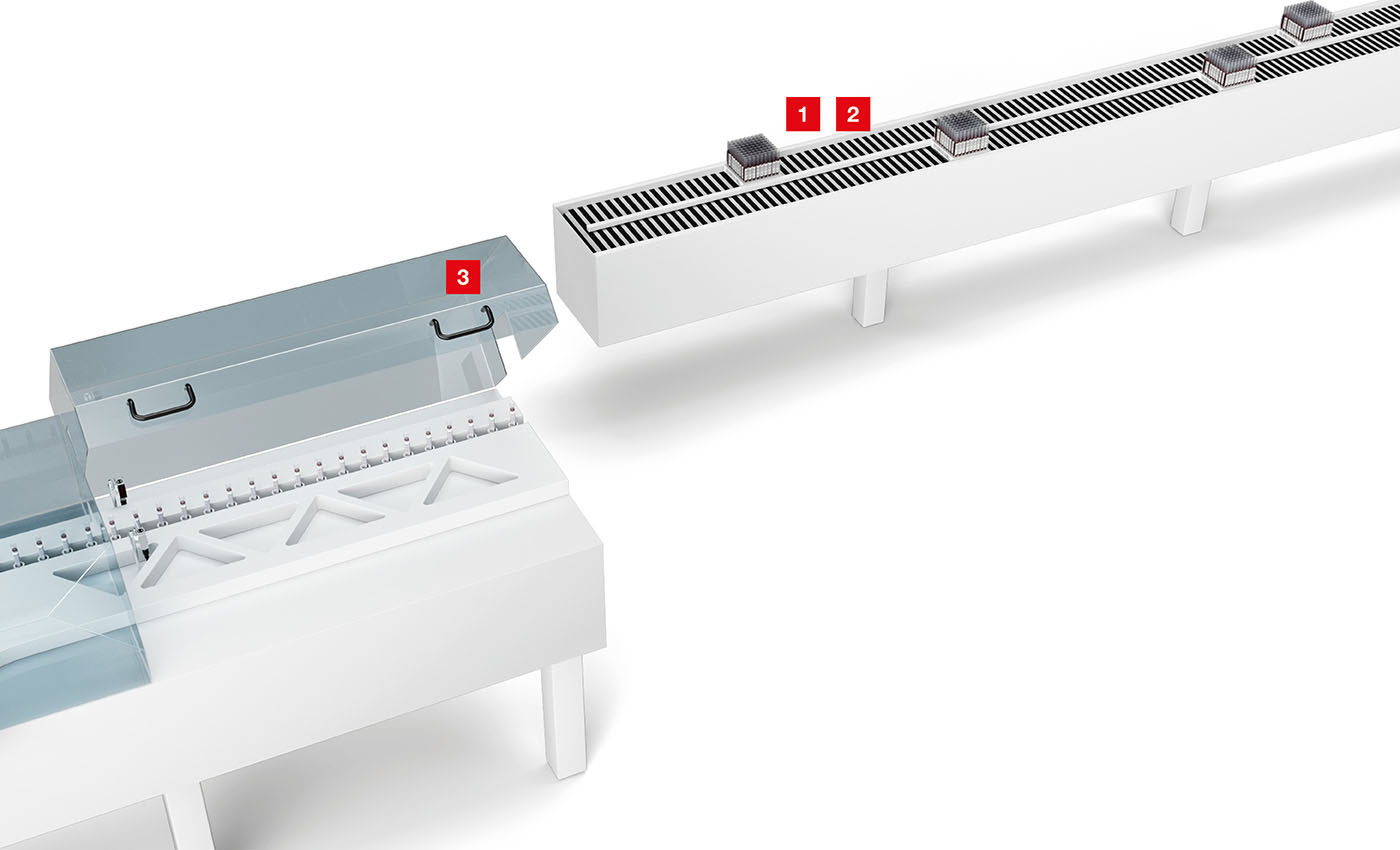 为了进行复杂分析,必须在各种仪器之间输送样品。分析仪的这种联网通过紧凑小巧的传送带和操作机器人变得越来越普遍。在进一步的分析步骤之前,必须快速、安全、可靠地移动各个部件,并重新进行正确的检测和分配。此外,必须确保样品路径的无缝可追溯性。传感器使样品运输更加可靠,并最大程度地减少分析仪停机的危险,因为分析仪停机可能危及样品的完整性。我们基于摄像头的紧凑型条码阅读器 DCR 200i 即使在运动中也能快速检测 1D 或 2D 条码,从而保证快速的样品运输。在运输路径上,安全接近传感器(例如 MC 300 或 RD 800)监控防护罩的闭合状态,并且信号灯显示运输单元的流程状态,使工作人员从远处即可辨识。
